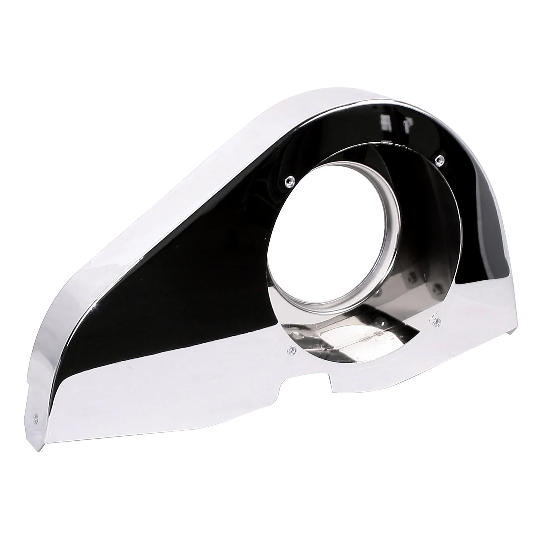 Brilliant chrome without air ducts. This unbaffled fan shroud features a cut out for an oil cooler by pass adapter and a rear fan lip to mount an air intake screen. For sue with external oil cooler. These do not have a hole for the throttle tube, it will need to be drilled.